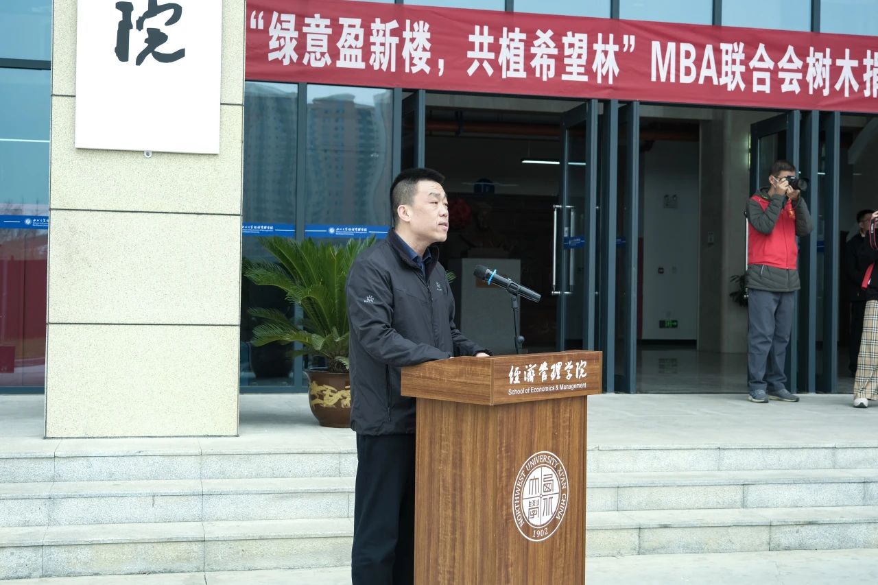 MBA校友代表刘伟发言。他说三月十二日植树节是一个充满希望与生机的日子。今天栽下的这片“希望林”,不仅是一片绿色的风景,更是我们对母校的深情寄托和祝愿,期许母校桃李满天下,期许每位西大学子都能成为社会栋梁,愿我们每位校友能以母校为荣,以实际行动回报母校,回报社会。