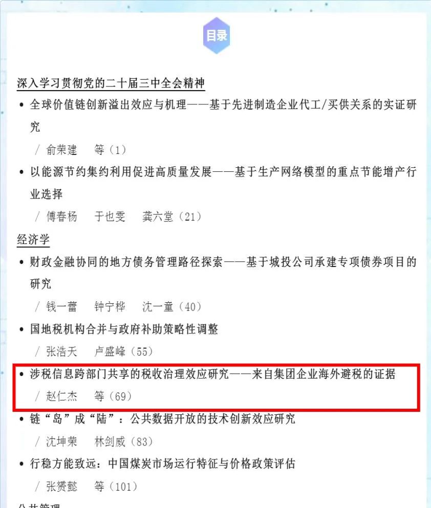 近日,我院经济学系赵仁杰教授作为第一作者的论文《涉税信息跨部门共享的税收治理效应研究——来自集团企业海外避税的证据》在顶级期刊《管理世界》2025年第2期发表,该文是赵仁杰老师主持的国家自然科学基金项目、陕西高校青年创新团队、yl7703永利集团仲英青年学者项目的阶段性成果。