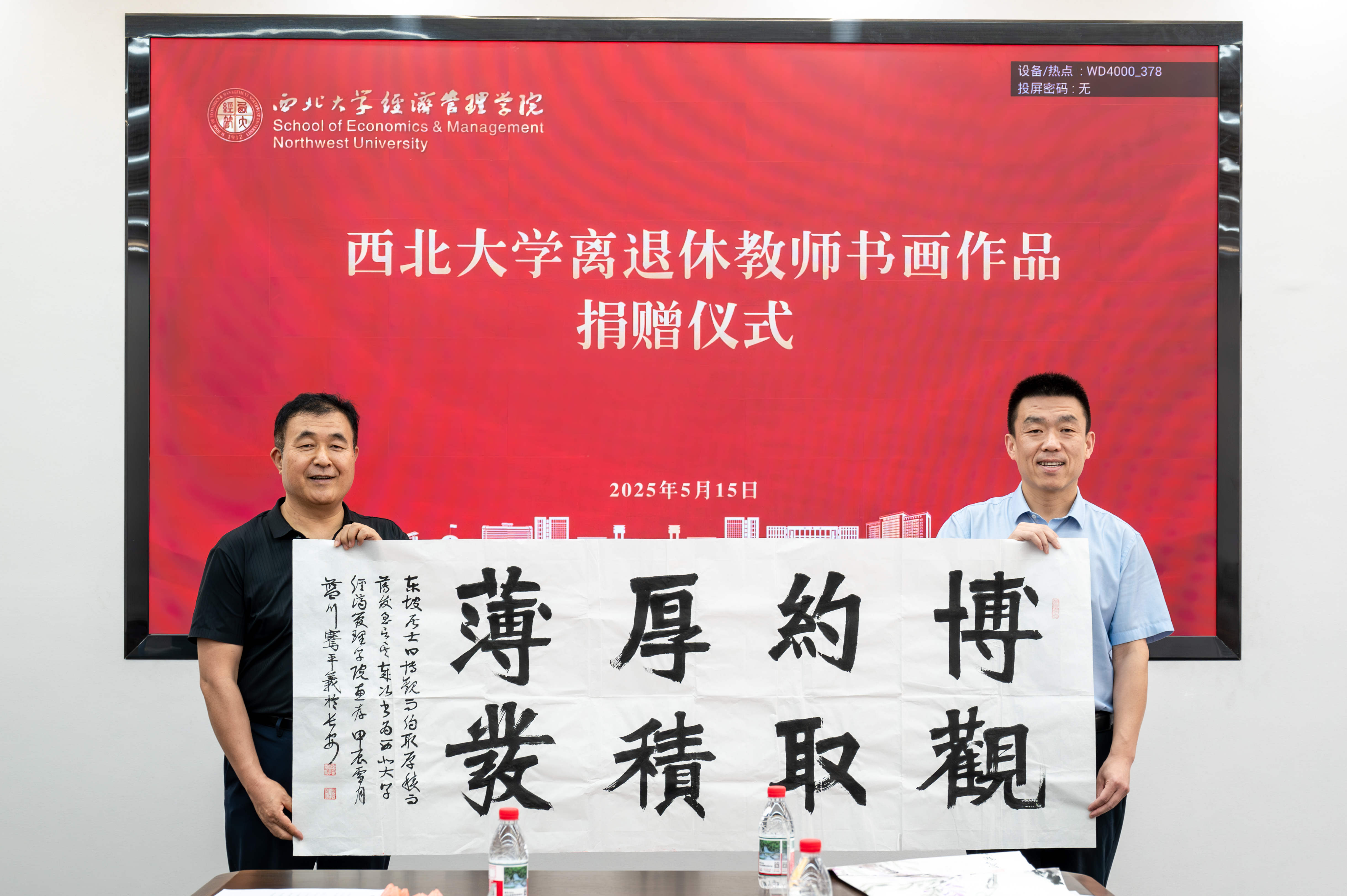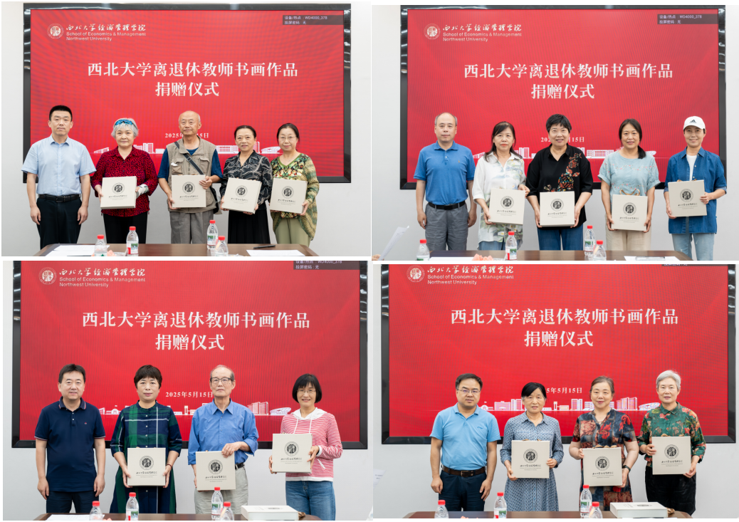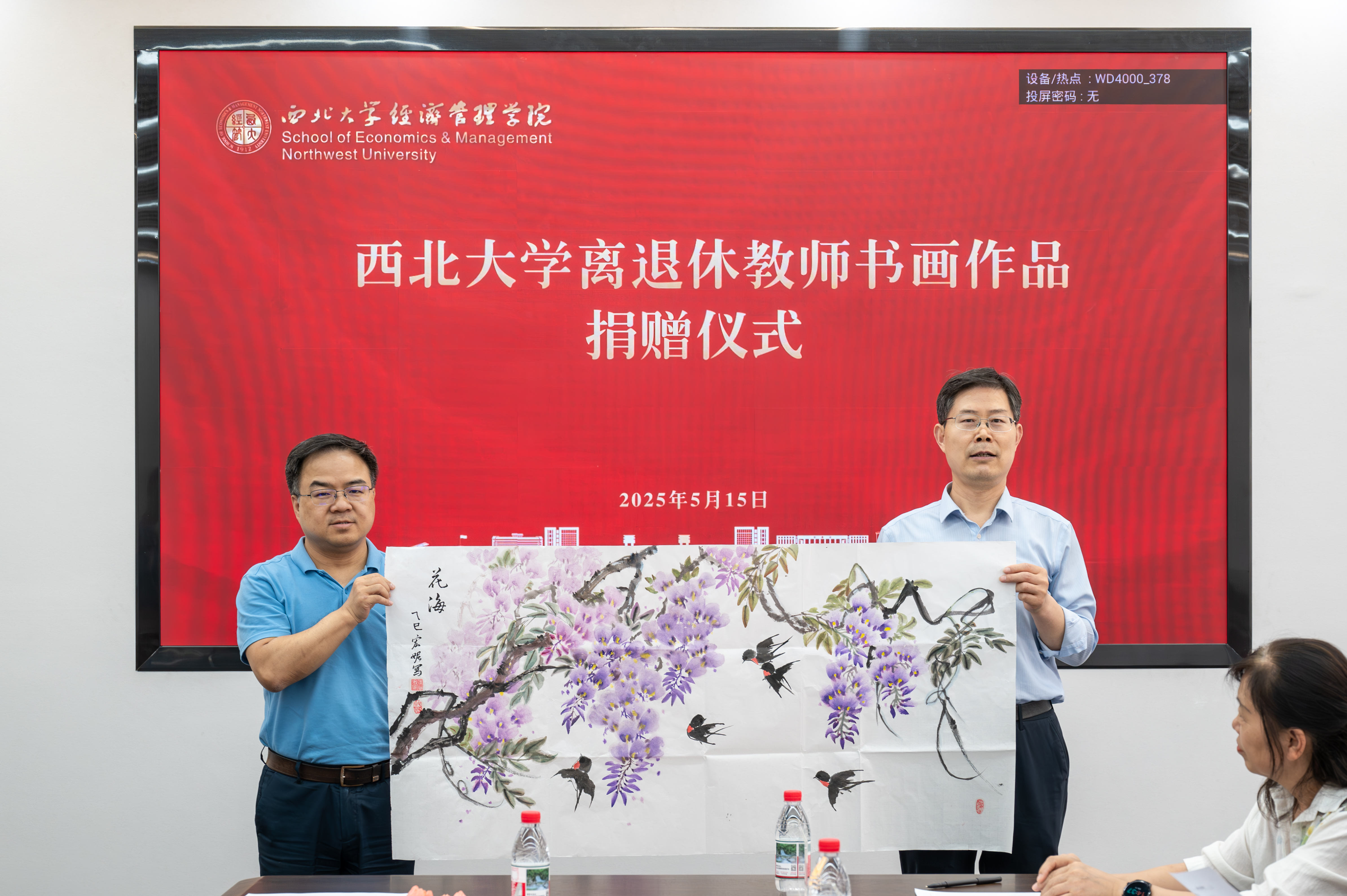 2025年5月15日下午,离退休教师书画作品捐赠仪式在我院宏观经济大楼623会议室举行。学校离退休工作处处长师耀武、副处长张琼,学院党委书记张宇、中国西部经济发展研究院副院长李文斌、学院院长助理、校友与国内合作办主任杨晓,离退休教师书画学会会长丁晶燕及捐赠教师代表,离退休工作处曹亮、于航,学院办公室主任张宇轩20余人参加。捐赠仪式由学院副院长张华岭主持。