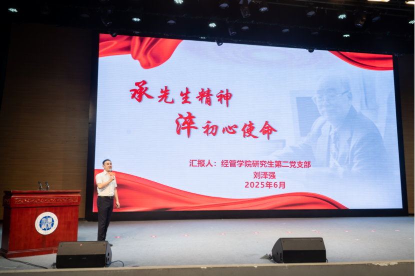 刘泽强以《承先生精神,淬初心使命》为党课主题,从一颗初心:在扎根西部中彰显奉献底色;一股硬气:在学术争鸣中坚守清正本色;一种担当:在潜心育人中践行严管厚爱等三个方面深情回顾了学院首任院长何炼成教授奉献西部、治学育人的伟大事迹,何先生的崇高精神也在指引和激励着一代又一代经管人拼搏进取,勇立潮头,为打造世界一流学院不懈奋斗,最终获得比赛二等奖。