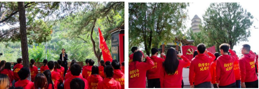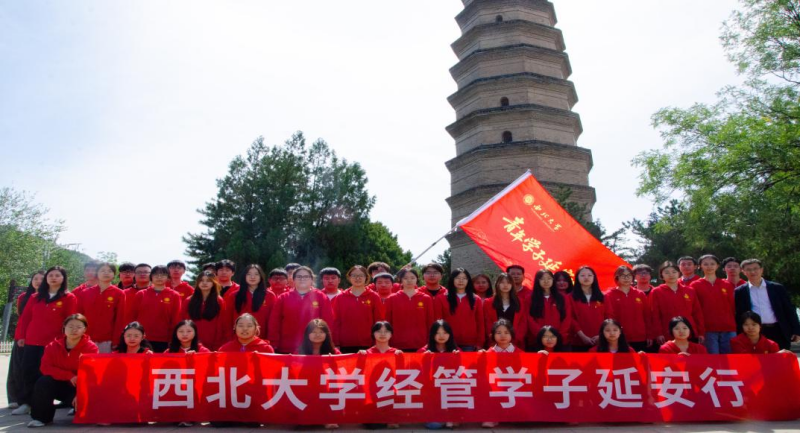 巍巍宝塔旁,师生们集体聆听现场教学课《我要去延安》;面对党旗重温入党誓词,师生们高举右拳,目光坚定,铿锵誓言回荡中尽显西大经管学子坚定的理想信念和精神追求。