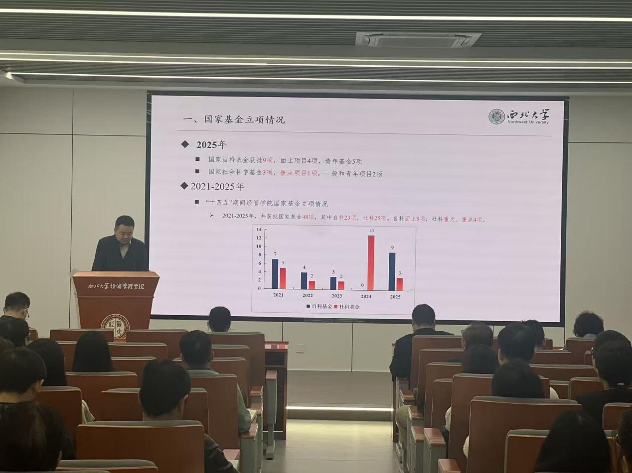 在聆听学校层面的宏观分析后,学院院长助理赵仁杰对我院2025年度国家基金的申报立项情况进行了更为具体、深入的总结分析。他运用详实的数据,从2021-2025年的申报数量、学科分布、年龄分布、基金衔接规律、近年趋势变化等多个维度,系统梳理了我院取得的成绩与存在的不足,为后续的申报工作提供了宝贵的经验借鉴。并结合2025年申报经验,汇报了2026年学院国家基金申报的详细工作计划。