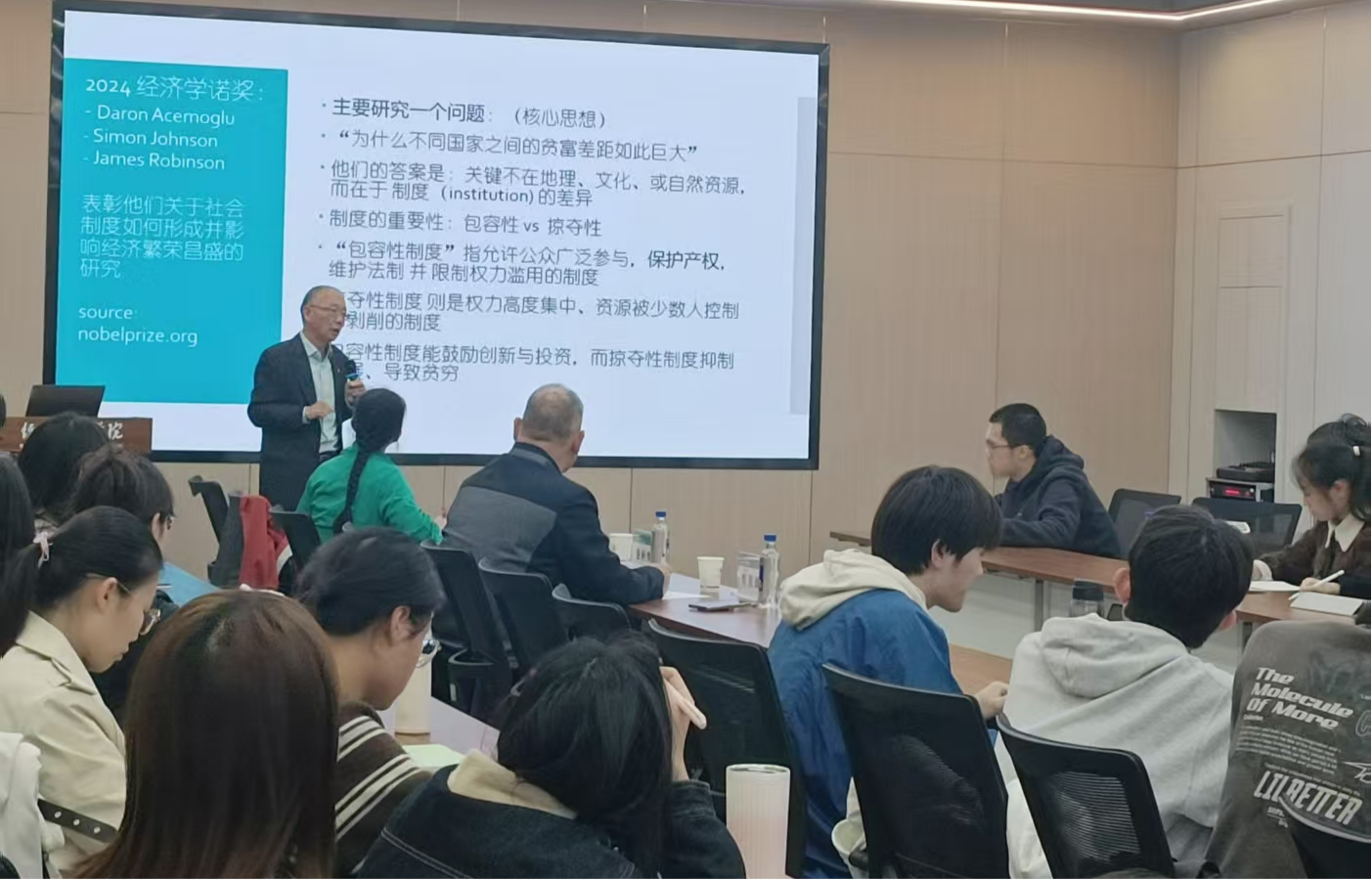 报告环节中,陈燕平教授以2024、2025 年诺贝尔经济学奖的获奖研究为核心案例,深入解读了向国际经济类学术期刊投稿的重点要求。2024年诺奖研究成果揭示了制度的基础性作用,包容性制度能激发创新投资,掠夺性制度则致贫穷;2025年诺奖研究阐释技术创新作为核心驱动力,其通过“破坏性创造”推动产业结构升级与经济持续增长。二者既相互争鸣,又在制度、政策与增长因果关系研究上互补,贡献显著。同时,会议还谈及工业革命后信息广泛应用,如通讯、AI 等技术对经济的影响,以及科技创新与经济发展的互动规律,为经济研究与发展带来诸多启示。