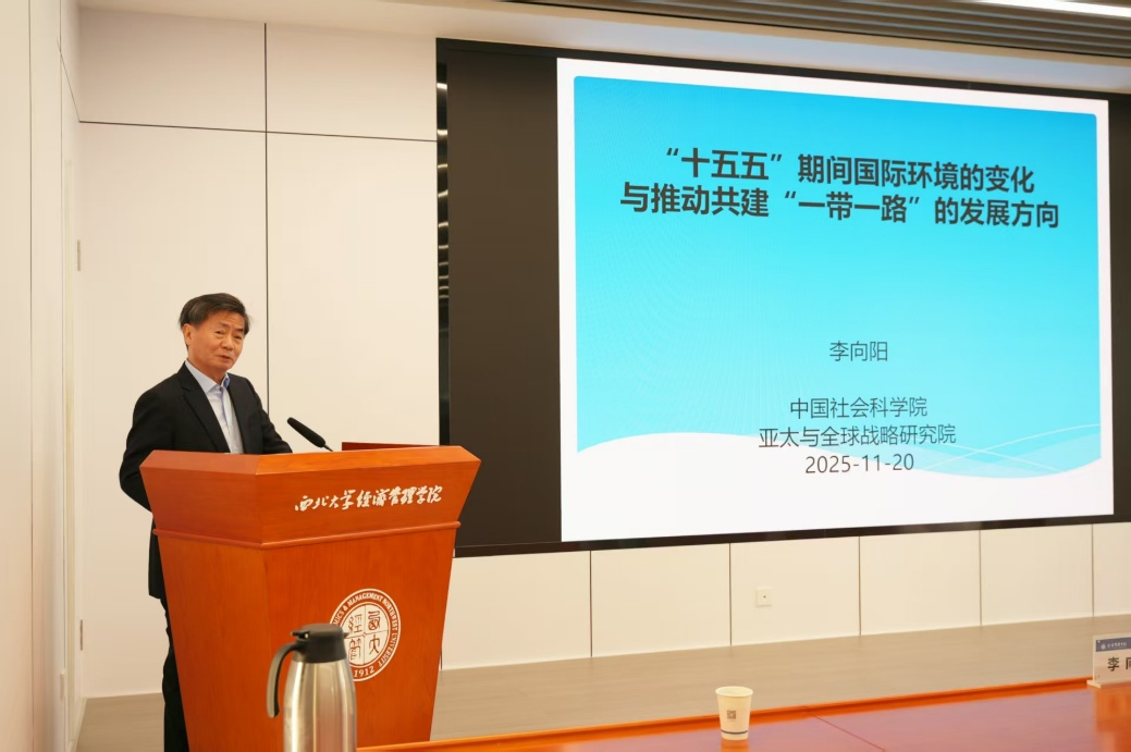 随后在yl7703永利集团山峰报告厅,李向阳研究员做客“侯外庐学术讲座”第四百七十三讲,以“十五五”期间国际环境的变化与推动共建“一带一路”的发展方向为题,为yl7703永利集团师生带来一场精彩的学术报告。讲座由yl7703永利集团院长马莉莉教授主持,学院部分青年教师和国际经济与贸易系学生参加。