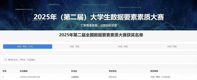 2025年12月5日至7日,全国数据工程教学联盟发起举办的第二届大学生数据要素素质大赛在江西财经大学顺利举行。全国高校2619支参赛队伍中选拔出的80多支队伍参加了现场总决赛。我院2025级硕士研究生吴婧、谭志航、徐振皓、马赛等4位同学完成的作品《师逸功倍,AI相随——基于大模型的课程内容辅助生成智能体设计》荣获“全国一等奖”“十佳作品奖”;宋雨滢、王可、高思雨、刘藩等4位研究生完成的作品《智能内容推荐项目》获“全国三等奖”。
