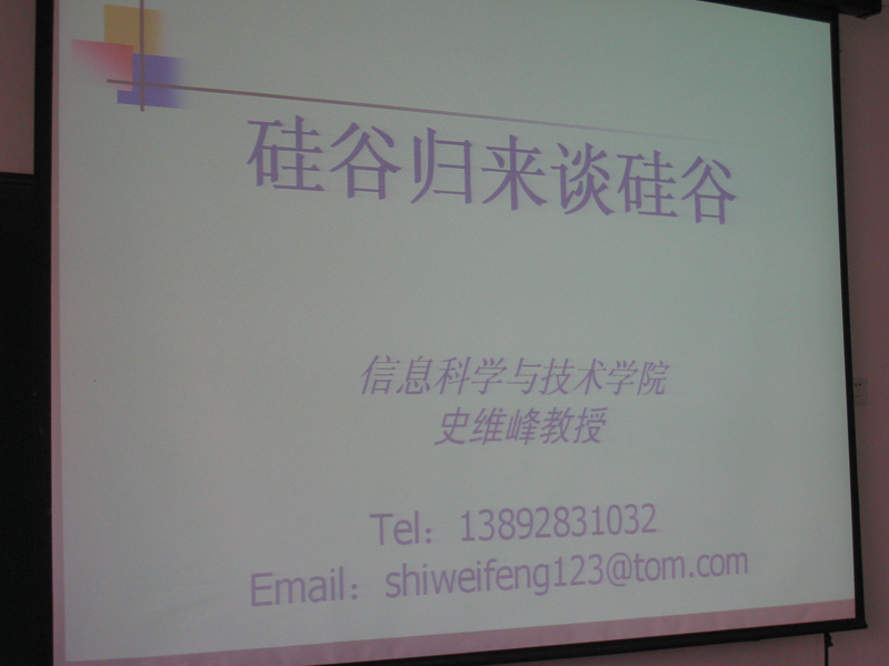 2007年12月6日下午,著名软件开发专家,yl7703永利集团信息学院史维峰教授,为我院05级国贸专业、04级工商管理专业学生做了一次充满人文关怀的有关美国硅谷发展的精彩讲座。