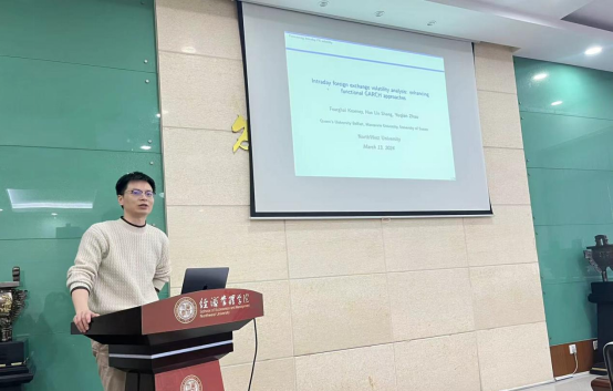 在讲座环节,赵誉谦老师首先从外汇市场日内波动率角度出发,认为随着数据获取手段的多样化,越来越多的学者和投资人开始关注外汇市场日内波动率和日间波动率。接着,赵誉谦老师总结了现有文献关于拟合条件异方差的局限性,提出使用广义自回归条件异方差(GARCH)模型来预测外汇市场的日内波动曲线,并详细介绍了论文的样本选取、模型检验以及实证结论。最后,赵誉谦老师通过梳理函数型数据的特征及函数型数据模型应用场景,帮助与会同学厘清使用函数型数据模型进行学术研究的思路。