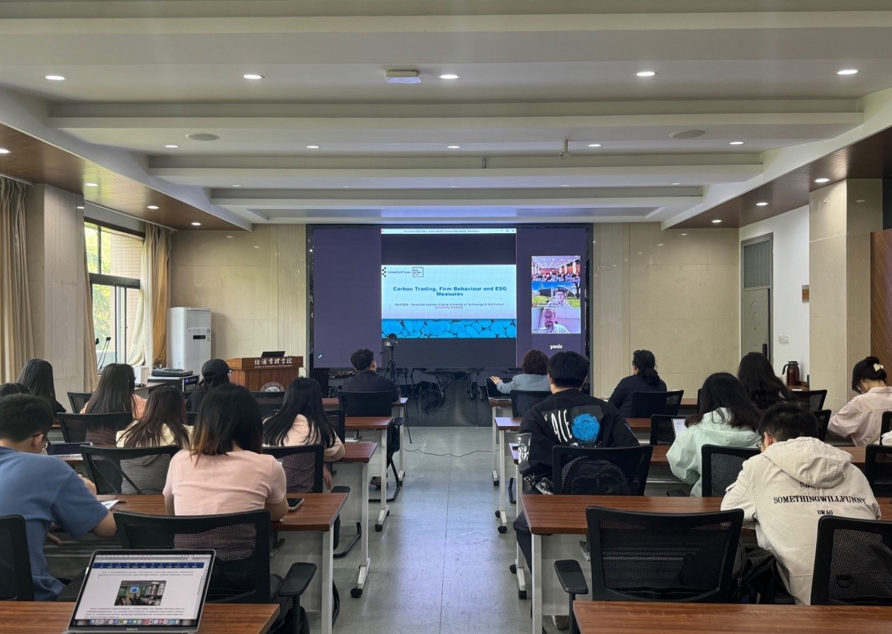 在讲座环节,Neil Kellard教授首先分享了他的最新研究成果,并对碳排放交易体系和公司治理的相关研究进行阐述。其次,Neil Kellard教授从文章的理论基础出发,基于具体的研究假设对文章的研究问题进行剖析,加深与会者对文章整体结构的了解。最后,Neil Kellard教授提出公司治理问题未来可行的研究方向,鼓励同学们从不同的研究范式和测度方法进行积极思考和探索,大胆提出观点和看法。
