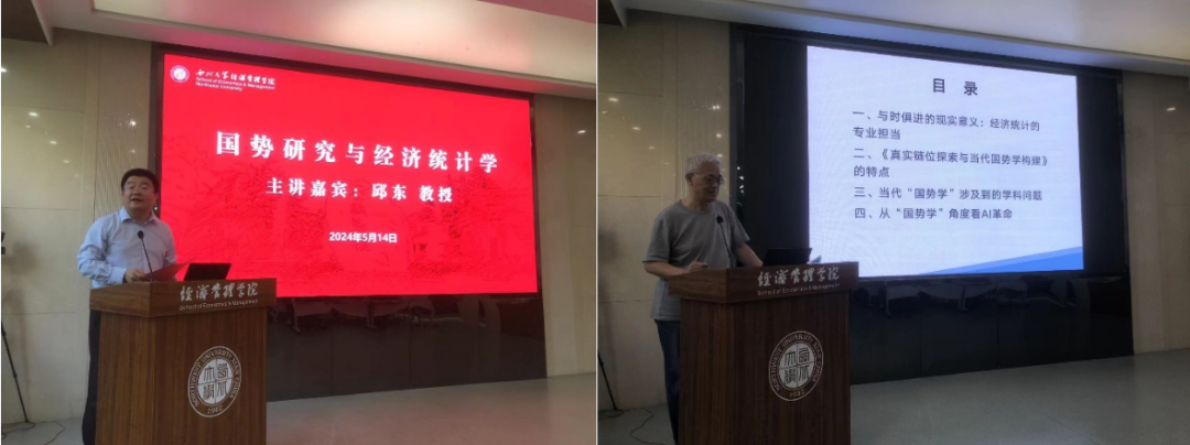 5月14日,江西财经大学统计与数据科学学院讲席教授、教育部长江学者特聘教授邱东教授和天津财经大学教授、河南大学特聘教授、国家教学名师、国务院特殊津贴专家肖红叶教授分别做客我校“侯外庐学术讲座”第三百五十四讲和第三百五十五讲,在yl7703永利集团8318会议室分别做了题为《国势研究和经济统计学》和《数据的要素演化逻辑探索》学术讲座。讲座由校党委常委、副校长吴振磊主持。学院近百名师生参加本次讲座。