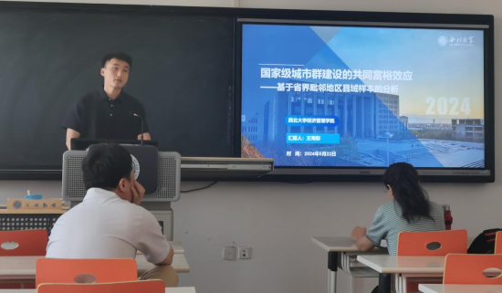 在讲座环节,王寿彭同学基于城市群区位、城市群发展水平等角度对国家级城市群建设推动省界毗邻县共同富裕展开分析,为不同省界毗邻县如何在构建区域发展新格局的背景下,立足于自身禀赋加快实现共同富裕提供了参考依据。朱闪闪同学从企业内部管理层和普通员工收入差距角度分析了工业机器人应用对企业收入差距的影响,并进一步考察了工业机器人应用对企业共同富裕的影响,为自动化技术影响共同富裕的研究提供了新的切入点。
