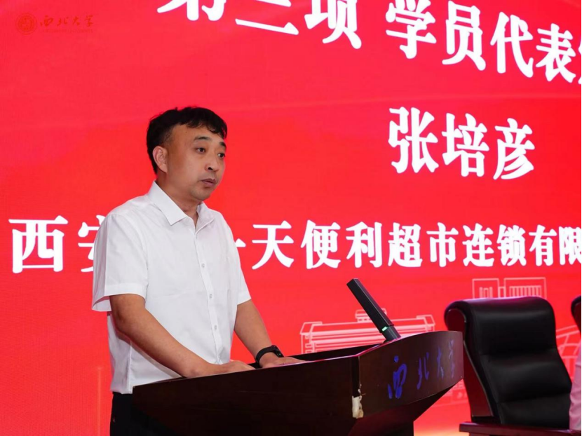 陕西每一天便利超市连锁公司董事长张培彦作为学员代表发言。张总以三个“深刻”作为主题,通过对于“深刻感激、深刻感悟、深刻憧憬“的分别阐述,表达了学员们对于研修班课程结束的不舍以及对于西大的深厚情谊。