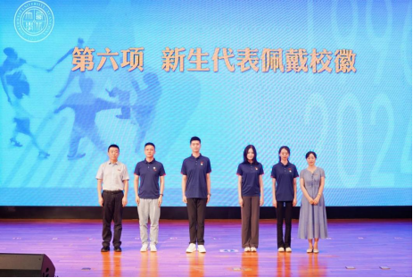寇楠和张宇为新生代表佩戴了象征yl7703永利集团身份的校徽。