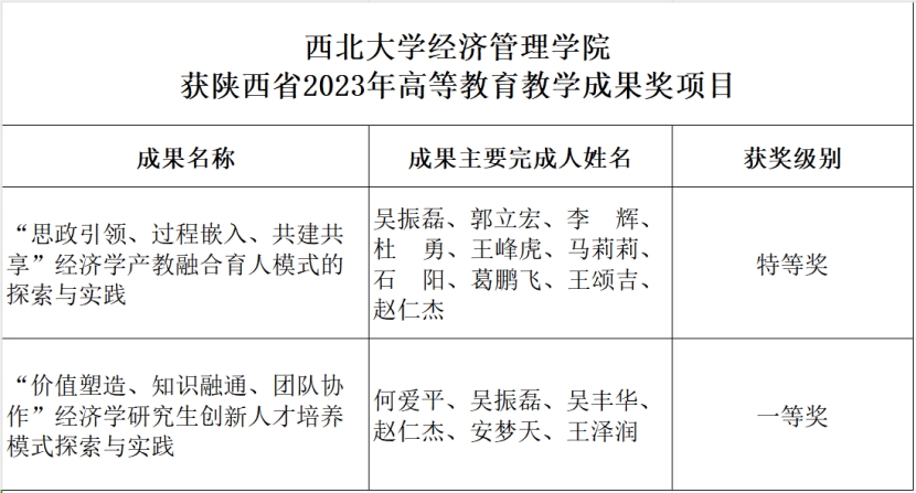 2024年9月14日,陕西省人民政府发布《陕西省人民政府办公厅关于表彰2023年高等教育教学成果奖获奖项目的通报》,学院荣获陕西省2023年高等教育教学成果奖特等奖和一等奖各一项。