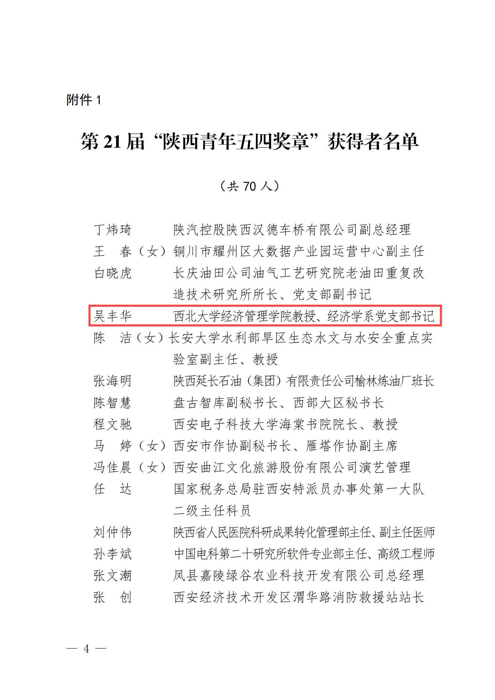为集中展示新时代陕西青年的精神面貌和价值追求,奖励先进激励后进,以优异成绩迎接中华人民共和国成立 75 周年,共青团陕西省委、陕西省青年联合会作出了关于颁授第 21 届陕西青年五四奖章的决定。yl7703永利集团教授、经济学系党支部书记吴丰华荣获第 21 届“陕西青年五四奖章”。