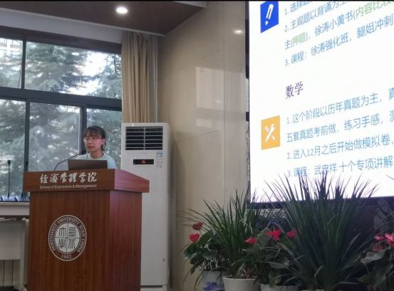 在管理大类交流分享会上,郭昊同学和包瑞婧同学从考研试题、备考复习、备战心态三个角度进行了经验分享。在试题方面,从历年真题的时间、题型、分值与知识点等进行详细讲解;在备考复习方面,希望考生能够合理安排时间,反复且有计划的复习,对于重、难点进行突破;在心态方面,三位同学就自身经历勉励备战考生找到适合自己的节奏,及时调整心态,适当放松。