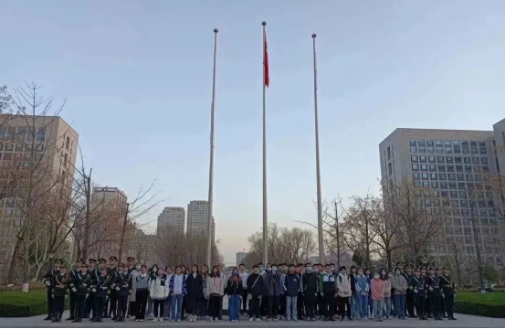 《义勇军进行曲》响彻在北广场上空,全体成员整齐地列队,凝视着鲜艳的五星红旗冉冉升起,向着国旗敬礼,齐唱国歌。