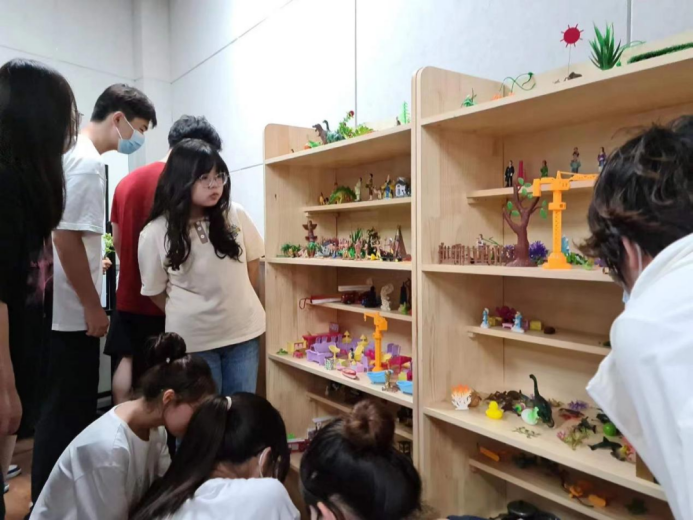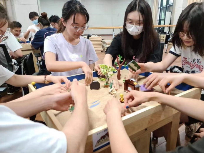 首先,张达老师邀请同学们挑选出来三件代表自己过去、现在、未来的沙具,并按照自己喜欢的方式进行摆放,小组成员之间对彼此沙具摆放位置的原因及其含义进行讨论。之后每个人都对自己选择的沙具及摆放的原因进行了阐述。通过表达阐述,同学们在增进彼此之间了解的同时,每个人对自己的内心状态也有了进一步的认知。