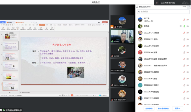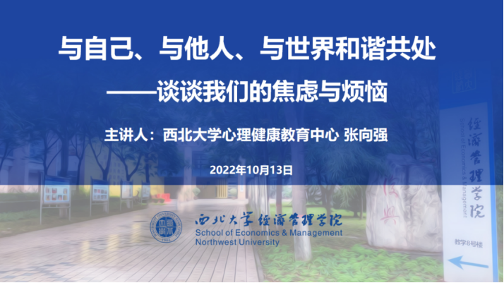 为进一步提高我院研究生心理素质,促进研究生心理健康发展,提高自我认知能力、人际沟通能力和心理素质能力。10月13日晚7点,学院邀请校心理健康教育中心常务副主任张向强老师,以线上会议形式为我院2022级研究生新生做了题为“与自己、与他人、与世界和谐共处—谈谈我们的焦虑与烦恼”的心理健康讲座。讲座由院党委副书记徐自成主持,院团委副书记齐江海和2022级全体研究生参加了此次讲座。