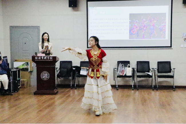 第二个小游戏为“猜猜哪个民族”,通过具有民族特色的服饰、美食等照片来大家猜是哪个民族。同学们抢答踊跃,现场氛围十分热烈。