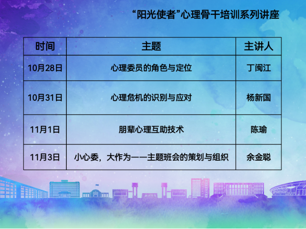 此次系列讲座帮助心理委员、宿舍长、学生心理社团成员等学生骨干树立了正确健康的观念,明确了自身的角色定位,掌握了必要的心理健康知识及助人技能,培养了一批合格的“阳光使者”,使其更好地以朋辈的身份开展大学生心理健康教育宣传活动,以助手的身份协助老师开展工作,在心理健康教育工作中发挥助人自助的作用。对加强心理健康教育工作,落实、开展好心理委员队伍培训建设工作,促进学生心理健康及个性化发展均具有重要指导意义。