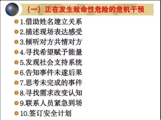 听完广西大学杨新国老师有关心理危机与干预的讲座,我深有感触。这次讲座让我进一步理解了尊重与换位思考这两个词。尤其是当杨老师讲到危机干预的十个方法的时候,真的感觉面面俱到又细细入微。共情、尊重与理解是在劝说一个迷途之人的良药。而我们作为沟通的代理人,更要秉持爱心、耐心、责任心,去关怀那些需要帮助的人。
