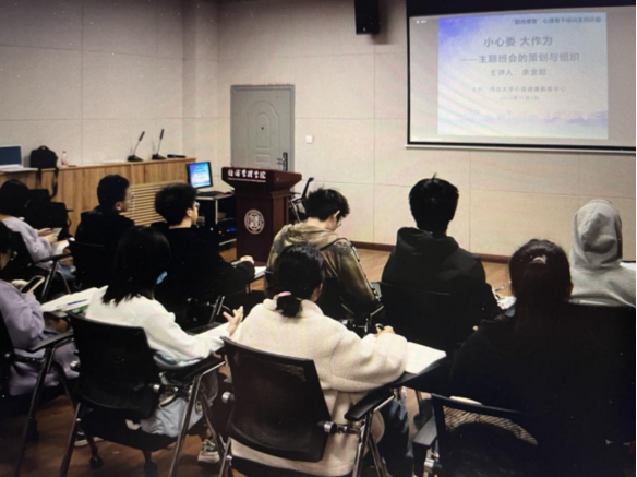 首先,余老师从主题心理班会的定义、意义和定位出发,明确了主题心理班会分为前期准备、班会执行和活动后期三个环节,并详细说明了这“三部曲”实施时的具体细节,使各位心理委员进一步理解了主题班会的实质与意义,同时也更加明确了自己的职责所在。在班会选题及活动开展方面,余老师通过讲解大量具体的案例与数据,向同学们介绍了众多有趣的班会选题以及趣味性活动,为日后各位心理委员开展主题心理班会提供了行之有效的新思路、新渠道和新方法。