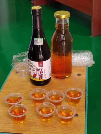 据弓厂长介绍,车间分为罐装间,调酒间,发酵间,储存间,过滤间,水处理间与净化间,目前已建成5条红枣深加工生产线,开发出了有机红枣系列的红枣白酒、红枣红酒、红枣醋饮、红枣浓缩汁等十多个产品,不断增加红枣附加值。在弓厂长的带领下,调研队观摩了整条流水线的生产,了解了红枣从采摘、压榨、发酵、过滤到包装销售成为果酒的一系列生产流程。当问起未来的生产目标,弓厂长胸有成竹:“我们有全年生产任务和销售目标,但无论任务和目标如何变化,公司永远把保证质量放在第一位,然后根据市场把价格调整到合理区间,优化包装,从而实现目标,完成任务。”