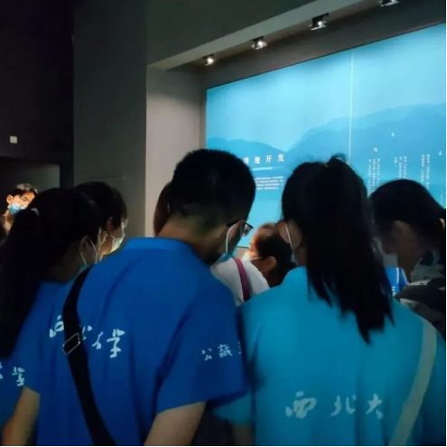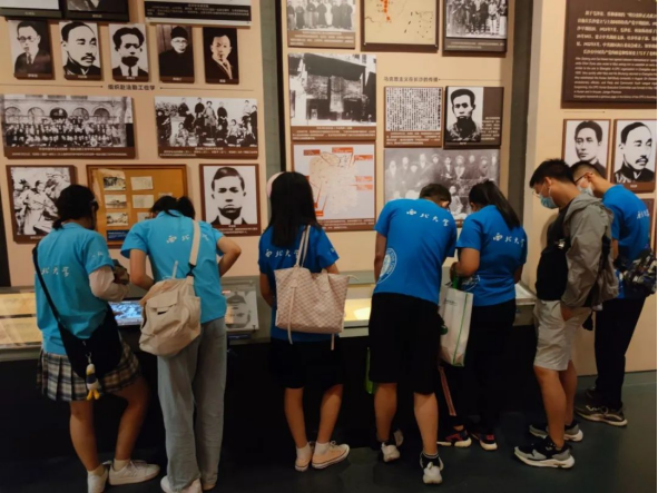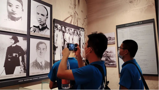 瞻仰结束后,实践队一行又前往了长沙党史陈列馆,这里以“长岛人歌动地诗——中国共产党长沙历史陈列”为展标,以中共长沙历史发展脉络为主题,以毛泽东、何叔衡从长沙城西的湘江轮船码头乘船赴上海,参加党的一大情景开始,以丰富的历史文物、详实的文史资料,采用多媒体表现形式,生动记述了党在长沙带领广大人民群众进行革命、建设和改革的伟大历程,全面展示中国共产党领导长沙人民革命、建设、改革所取得的辉煌成就和宝贵经验,突显了建党初心和使命,是一部“走着读”的长沙地方党史。
