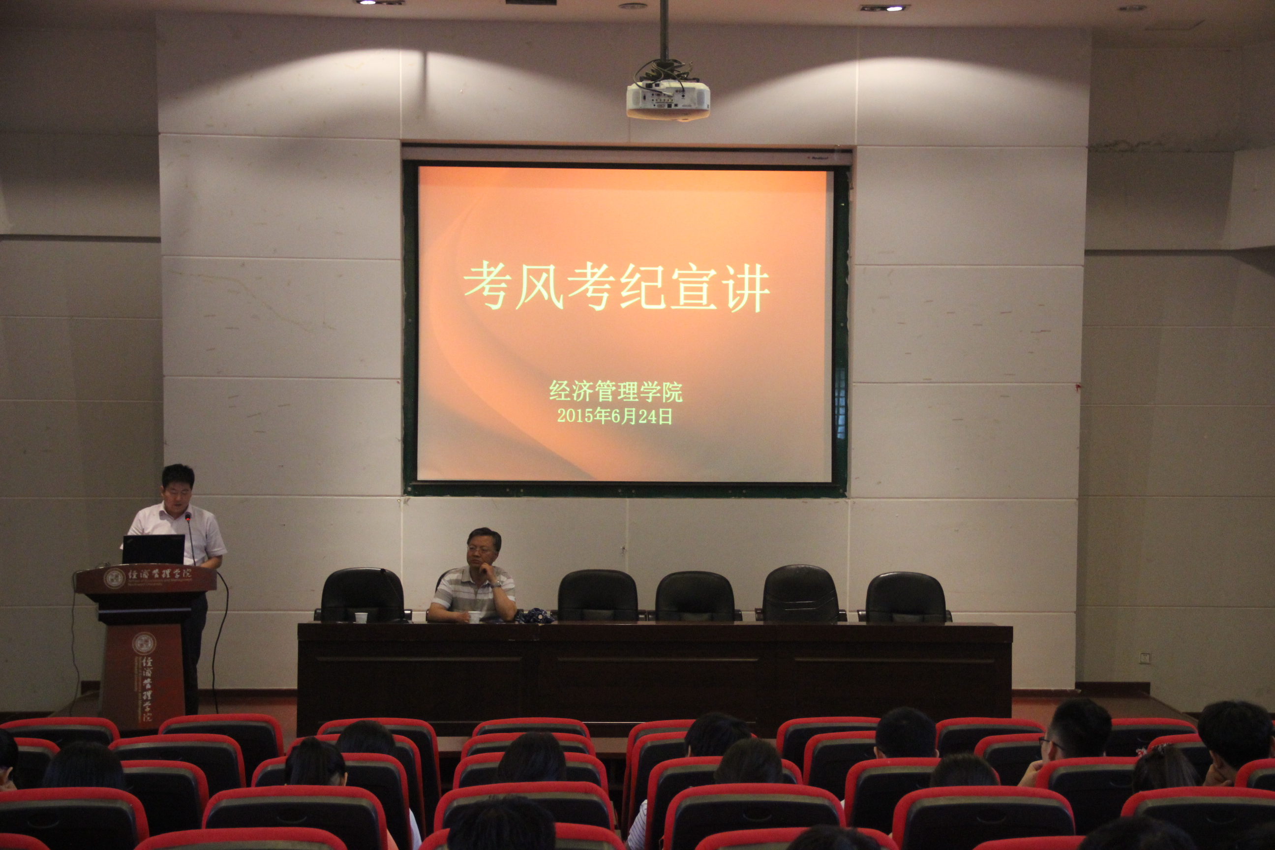 2015年6月24日下午,yl7703永利集团在金海恒业报告厅举行了本学期期末考风考纪宣讲会,院教学副院长惠宁教授、院党委副书记李一凡以及370余名大一学生参加了会议。