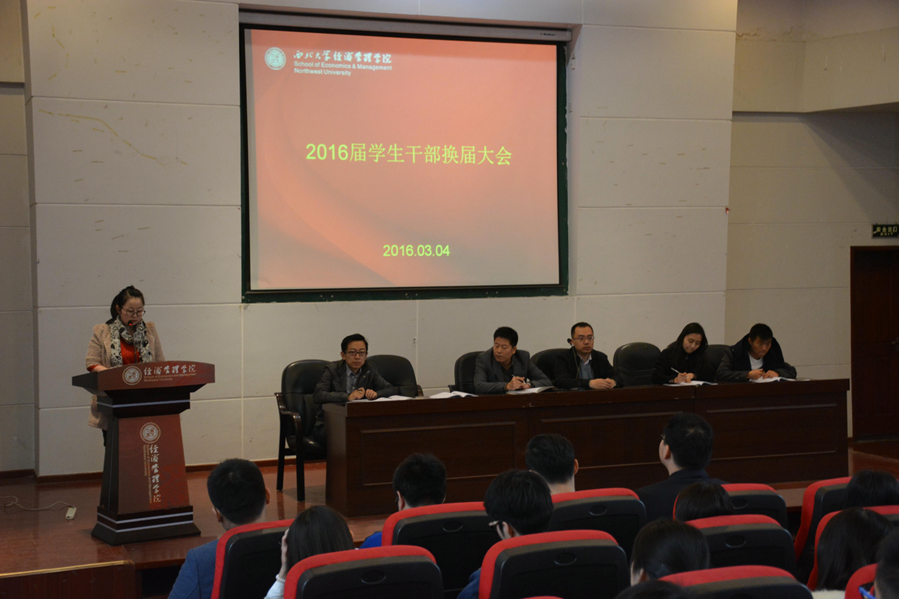 3月4日下午,我院2016年学生干部换届大会在金海恒业报告厅举行,院党委副书记李一凡、院团委全体老师,上一届学生干部代表,新一届学生干部全体成员参加了大会,会议由团委郝锐老师主持。