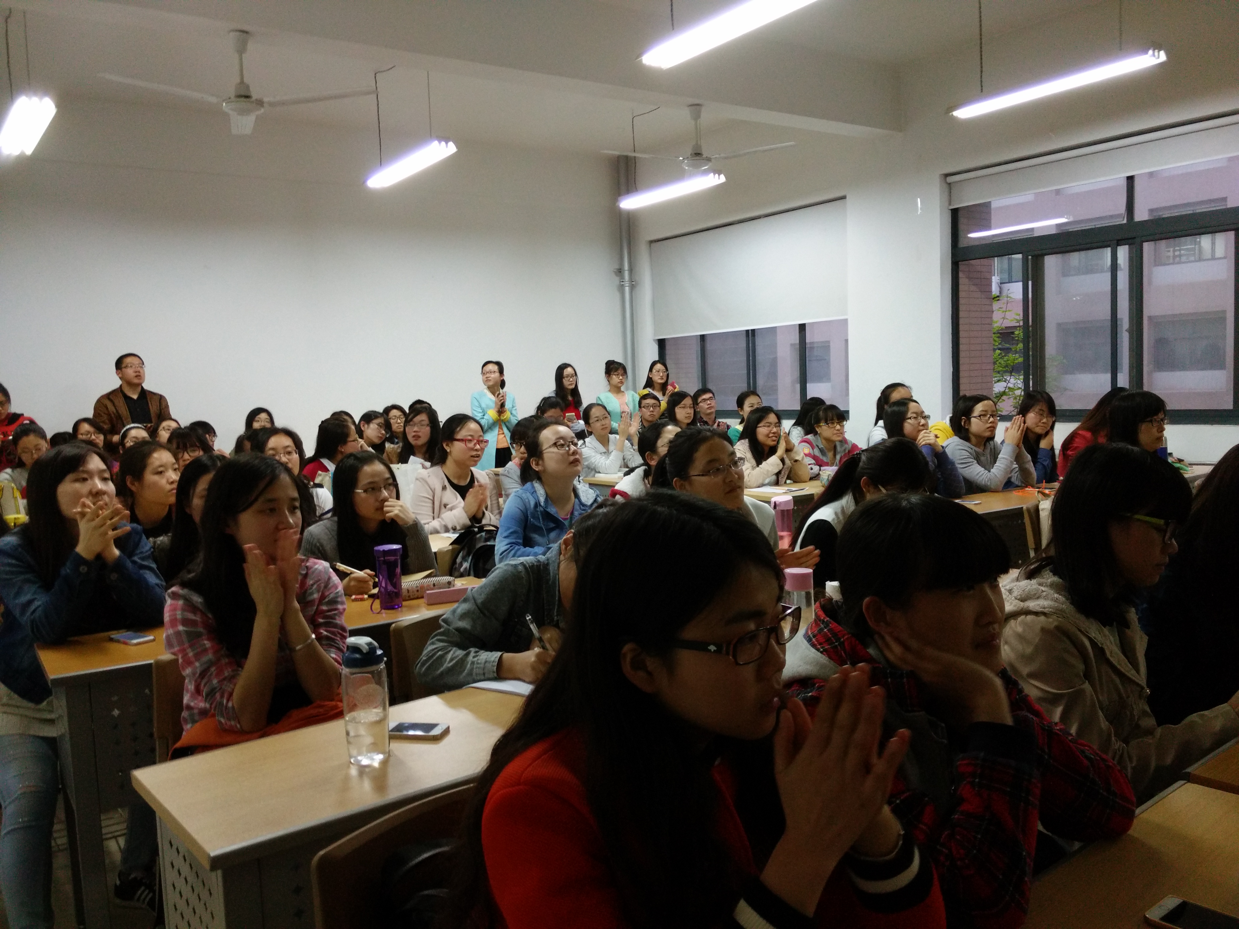 本次交流会特别请到了研三的“面霸”学长学姐——韩璐、陈彼德和费小颖,他们分别为同学们讲解了国考、银行和企业三大方向的求职经验,吸引了全校研究生及本科学生的参加,一百多人的大教室早早就座无虚席,即使门口也站满了热切聆听的同学。