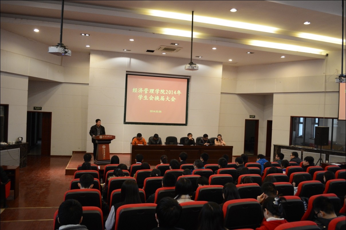 3月5日下午,学院在金海报告厅隆重举行了2014年学生会换届大会,院党委副书记李一凡,院团委全体老师,上一届学生会主席团以及新一届学生会全体成员参加了会议。