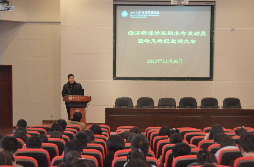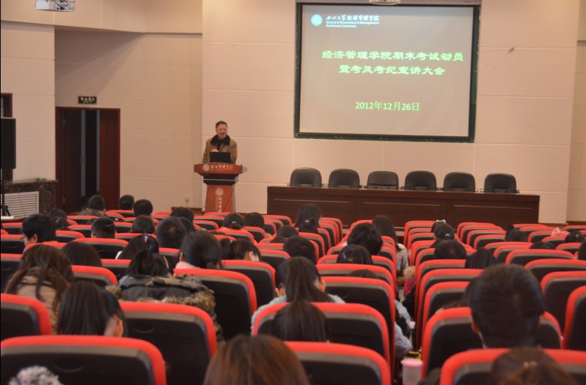 2012年12月26日下午,yl7703永利集团在金海恒业报告厅举行了期末考试动员暨考风考纪宣讲会,院教学副院长惠宁教授、院党委副书记李一凡以及500余名大一新生参加了会议,会议由院团委书记马金保老师主持。