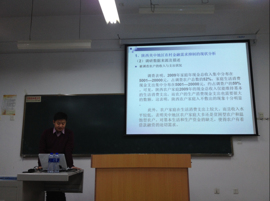 杨贺同学基于其进行的大学生创新性实验计划项目,作了题为《陕西关中地区农村金融抑制及制度创新研究——以农户金融需求为视点》的报告。他认为,我国农村特别是陕西关中地区存在着较为严重的金融抑制现象。该项目以农户的金融需求为视点,基于实地调研数据,运用实证分析和数理统计的方法,分析了关中地区农村金融抑制的表现和影响,认为必须从扩展农户金融需求和增加农村金融供给两方面来制定相关政策。