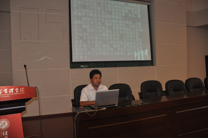 丁老师在讲座中运用了PPT等多媒体工具,图文并茂,深入浅出的向同学们介绍了防盗、防抢夺、防抢劫、防欺骗、防性骚扰、防火、大学生心理健康、网络安全、择业安全、家教安全、节假日安全、交通安全、防传销等方面的知识,通报了近几年大学校园发生的犯罪事件和大学生不安全事例,对个别学生发生上当受骗,违章用电引发火灾等事故进行了原因分析。最后,丁老师对大学生如何增强安全意识,提高安全防范的技巧向同学们作了介绍。