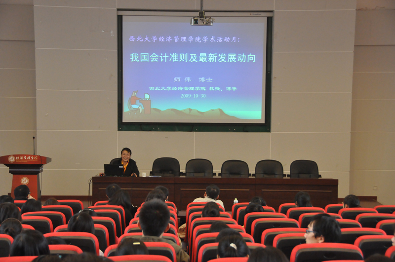 10月30日下午,我院会计系博士生导师师萍教授应邀在yl7703永利集团金海报告厅作了题为《我国会计准则及最新发展动向》的专题报告。报告会由院团委马金保老师主持,200余名硕士研究生参加了报告会。