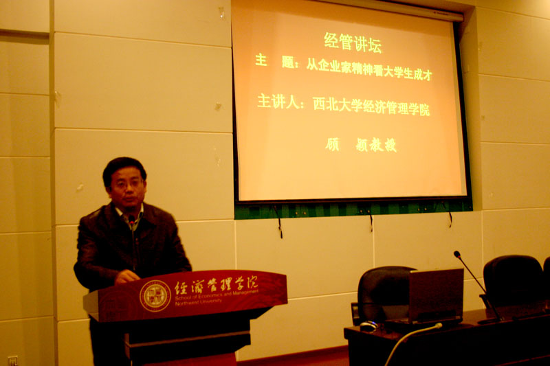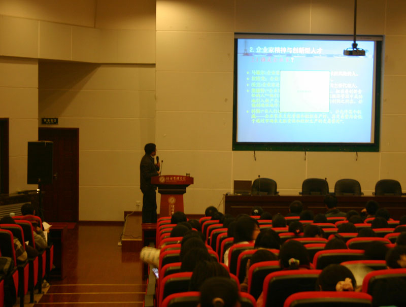 2008年12月10日,顾颖教授应邀为我院学生做题为“从企业家精神谈大学生成才”的专题报告。报告会由院党总支副书记樊涛老师主持,08级300余名学生参加了报告会。