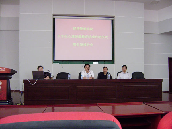2008年5月28日下午,我院在金海恒业报告厅举行了心理健康教育活动启动仪式暨首场报告会。学生工作处副处长张少为老师、学校大学生心理咨询中心执行主任、心理学副教授郑安云老师、大学生心理咨询中心同雪莉老师,学院党总支书记薛来前老师、副书记樊涛老师和学院学生工作干部及200余名学生代表出席了本次活动。