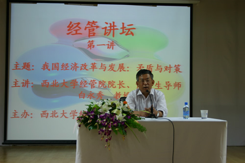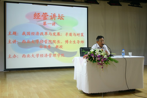 2006年5月10日下午,“经管讲坛”(第一讲)在南校区报告厅举行,经管学院院长、博士生导师白永秀教授作了题为“我国经济改革与发展:矛盾与对策”的首场报告,报告会由院党总支副书记樊涛同志主持,学院部分教师及各类学生共400多人参加了报告会。