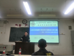 王思琛分享了参与学术会议的难忘经历与心得体会。他以会议内容为类别,从专家学术报告、学术论文选题讨论及专家指导三个方面进行了详细的介绍;分五个层次分享了他的内心感受,包括思想信念、真理探索等。王思琛同学在分享过程中借用了诸多思想大家的名句来诠释他的学术之旅,例如伏尔泰、凯恩斯、王国维等人,令研究生们印象深刻。