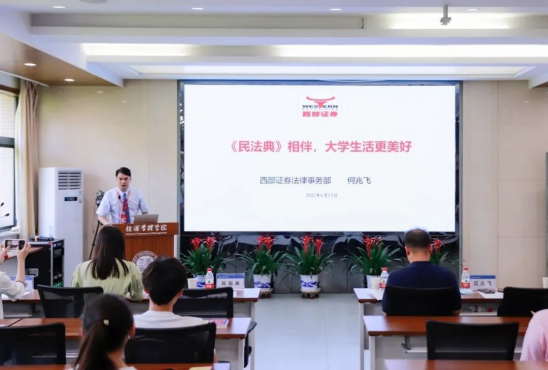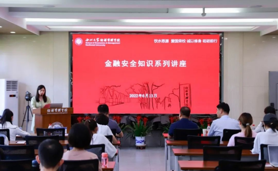 为进一步普及金融安全知识,有效提升学生征信保护意识和防范金融诈骗的能力,6月13日下午,yl7703永利集团联合西部证券举办“饮水思源 爱国荣校 诚以修身 砥砺前行”金融安全知识讲座。本次讲座由西部证券何沛、何兆飞主讲,学生工作部(处)郑曙光和50名学生出席了本次活动,讲座由周宛瑾主持。