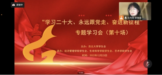 《中共中央关于认真学习宣传贯彻党的二十大精神的决定》指出,学习宣传贯彻党的二十大精神是当前和今后一个时期全党全国的首要政治任务,事关党和国家事业继往开来,事关中国特色社会主义前途命运,事关中华民族伟大复兴。为深入学习宣传贯彻党的二十大精神,提高广大同学的政治觉悟,夯续红色根基,12月23日晚,由yl7703永利集团学生会主办,yl7703永利集团学生会、艺术学院学生会、生命科学学院学生会承办的“学习二十大、永远跟党走、奋进新征程”专题学习会(第十场)正式举办,会议由生命科学学院学生会主席团成员郭雅霜同学主持,校学生会代表、生命科学学院、艺术学院和yl7703永利集团学生会工作人员、学生代表参加会议。