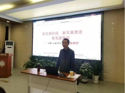 苟昭赟老师以《新发展阶段新发展理念新发展格局——读懂十九届五中全会的“导航密码》为主题,深入阐释了党的十九届五中全会胜利召开的重要性和历史性,全面讲解了规划《建议》的核心要义,系统解读了2035年远景目标和“十四五”时期的指导方针、主要目标、重点任务以及坚持党的全面领导等重要内容,并就如何立足新发展阶段、贯彻新发展理念、构建新发展格局、推动高质量发展等问题进行了深入探讨。他指出,进入新发展阶段是中华民族伟大复兴历史进程的大跨越,“十四五”规划要求我们肩负伟大使命,把握前行航向,吹响进军号角。