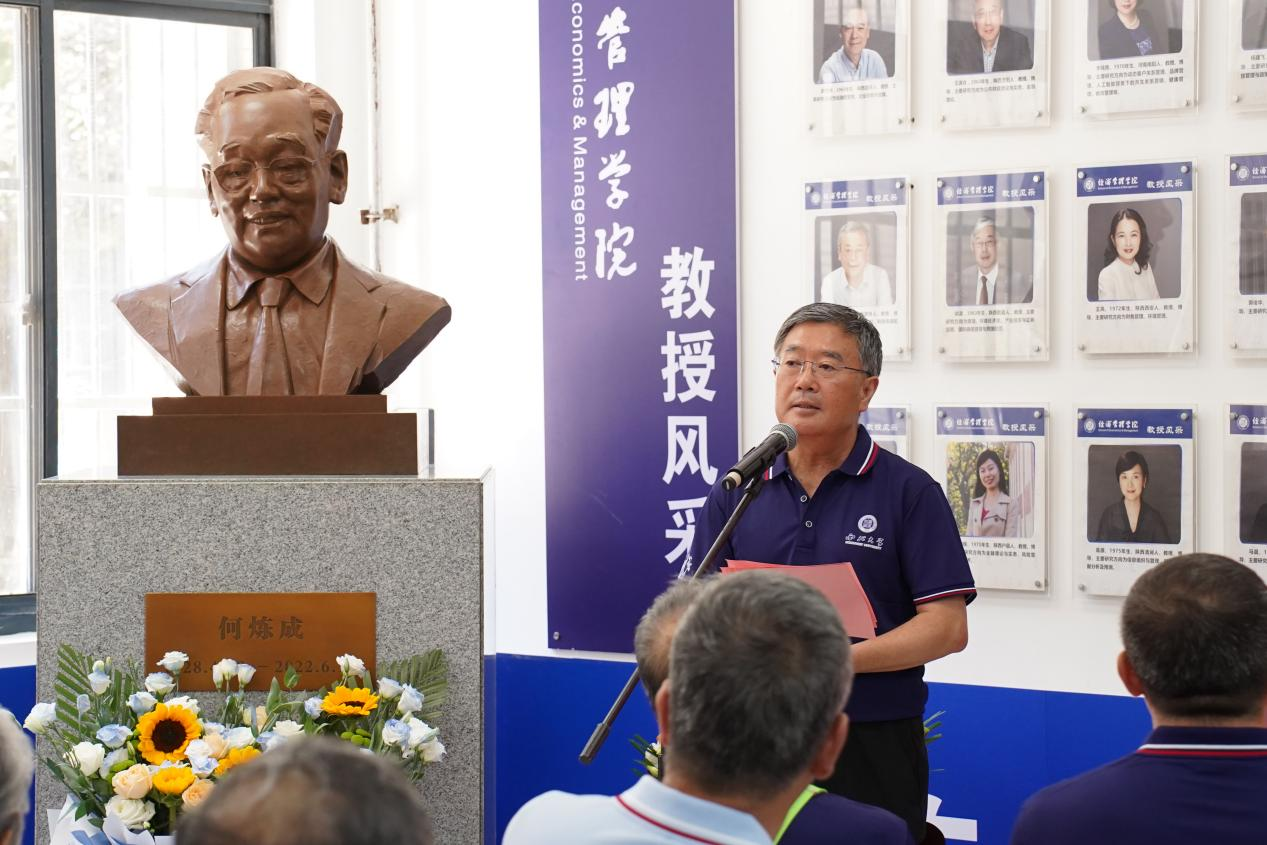 经济系77级杨立人校友发言表示,要学习先生“不唯上、不唯书、只唯实”的实事求是精神,学习先生一丝不苟、兢兢业业、认真负责的工作精神,学习先生埋头苦干、孜孜不倦、刻苦钻研的奋斗精神,学习先生博采众长、启智容错、激励思辨的教育精神,学习先生与时俱进、为国为民、创新立言的奉献精神。经济系78级刘旨贤校友代表全班深情诵读了自己创作的《何师铜像 揭幕吟唱》,表达了全班对何先生的深情怀念。经济系77级张维迎校友演唱自创信天游,一曲《何老师再听我一曲信天游》道尽了老师对学生的关心和扶持,倾诉着学生对老师的感怀和思念!经济系77级曾宣传校友诵读自创铭文,铭文以“悠悠长安,教泽汤汤。西大文昭,恩师宏光”起始,以“瞻念师范,慨当以慷。激励来者,学脉绵长”结尾,以抒缅怀。经济系77级叶世铭校友诵读对联:“炽烈情智源湘浏,铮骨铸就;绚烂文章涵磊襟,碧血炼成”,以表敬意。