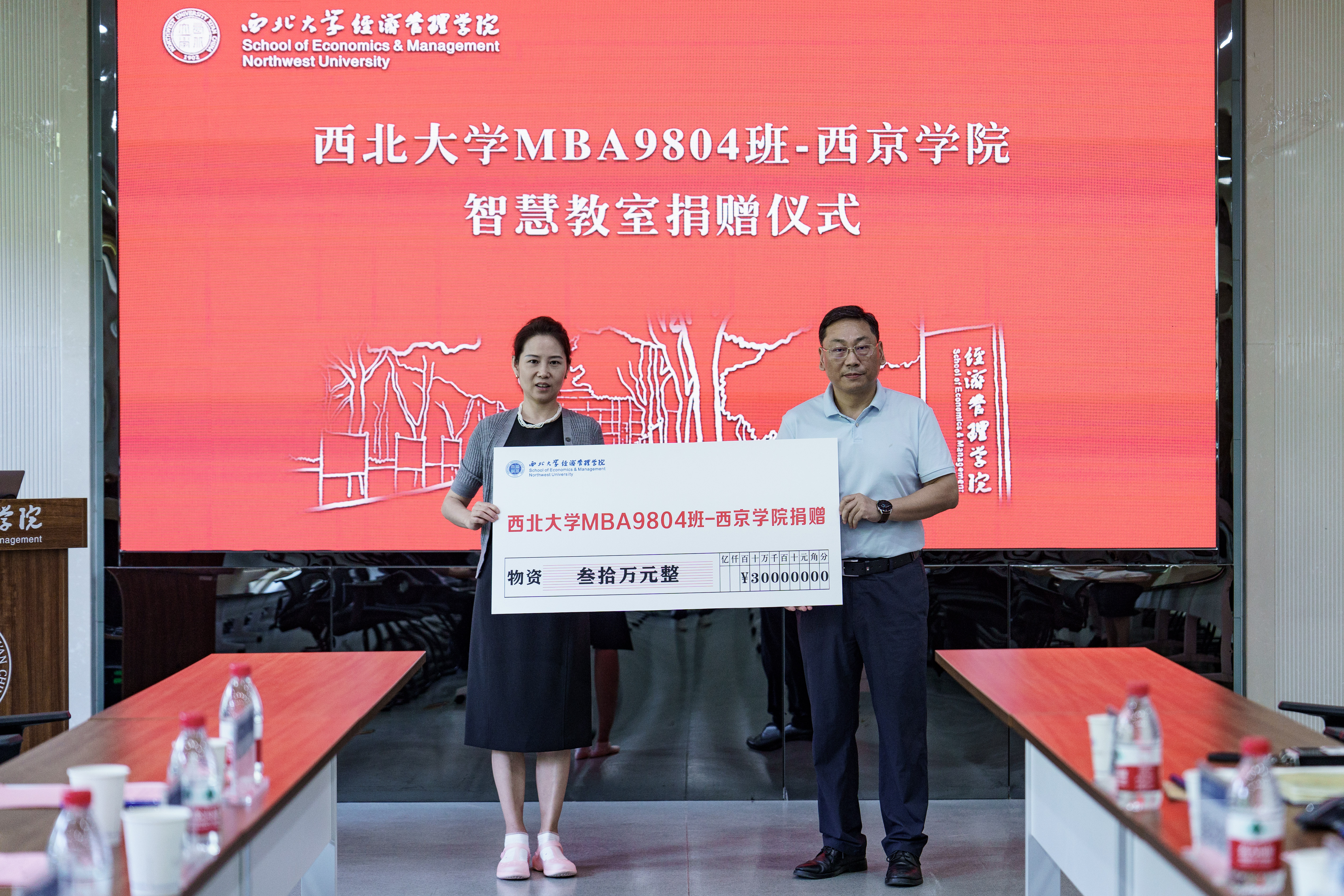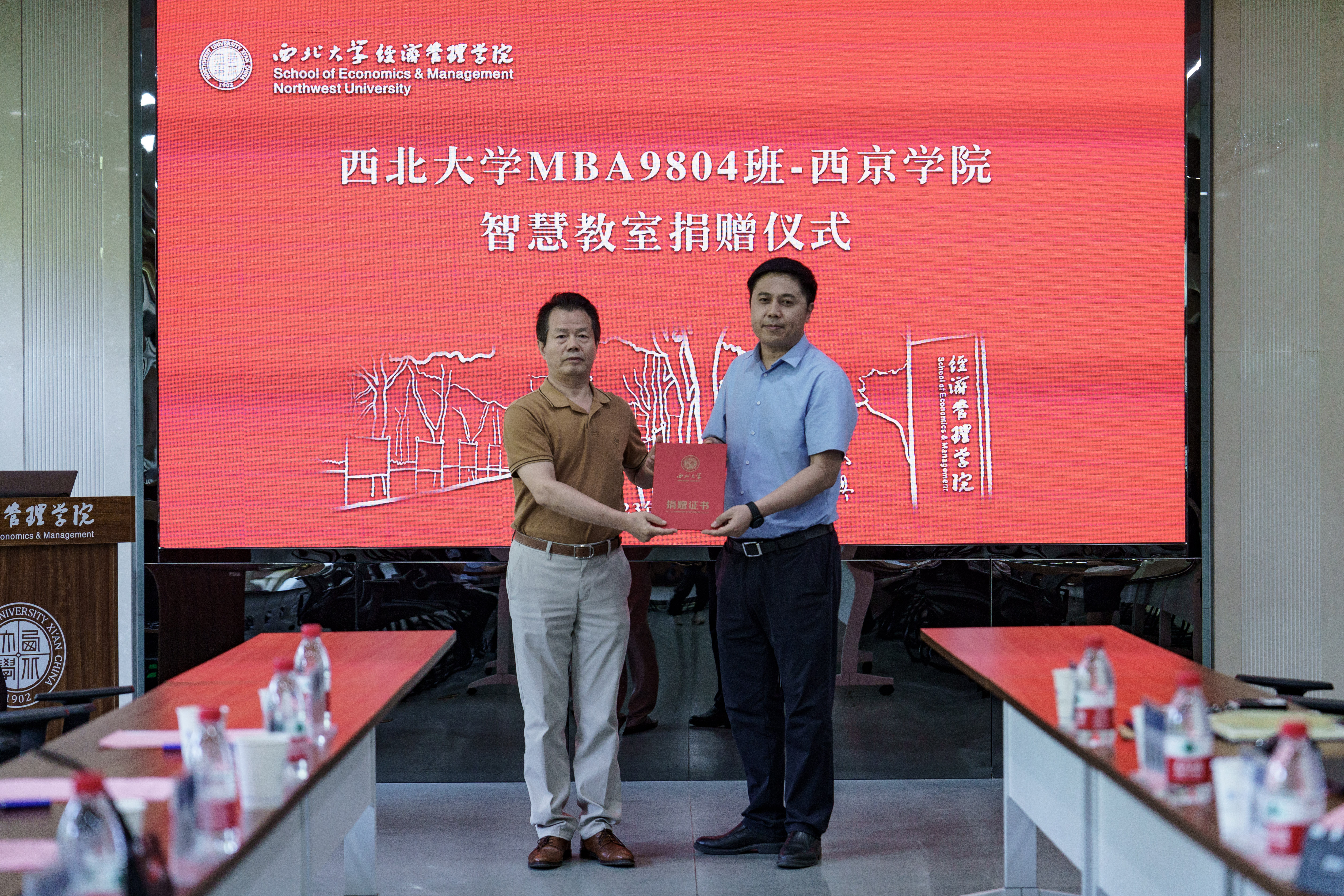 捐赠仪式上,任芳代表MBA9804班和西京学院向我院捐赠30万元智慧教室建设专项资金,崔延力代表学校向捐赠集体颁发了捐赠证书。